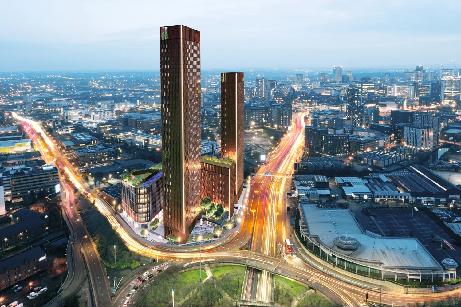 This £360m project will replace a low-rise industrial estate with up to 620 new homes, 732 student units, retail, office, and leisure spaces. When complete, it will stand at 172 metres and, with over 53 storeys, will become Birmingham’s tallest building.