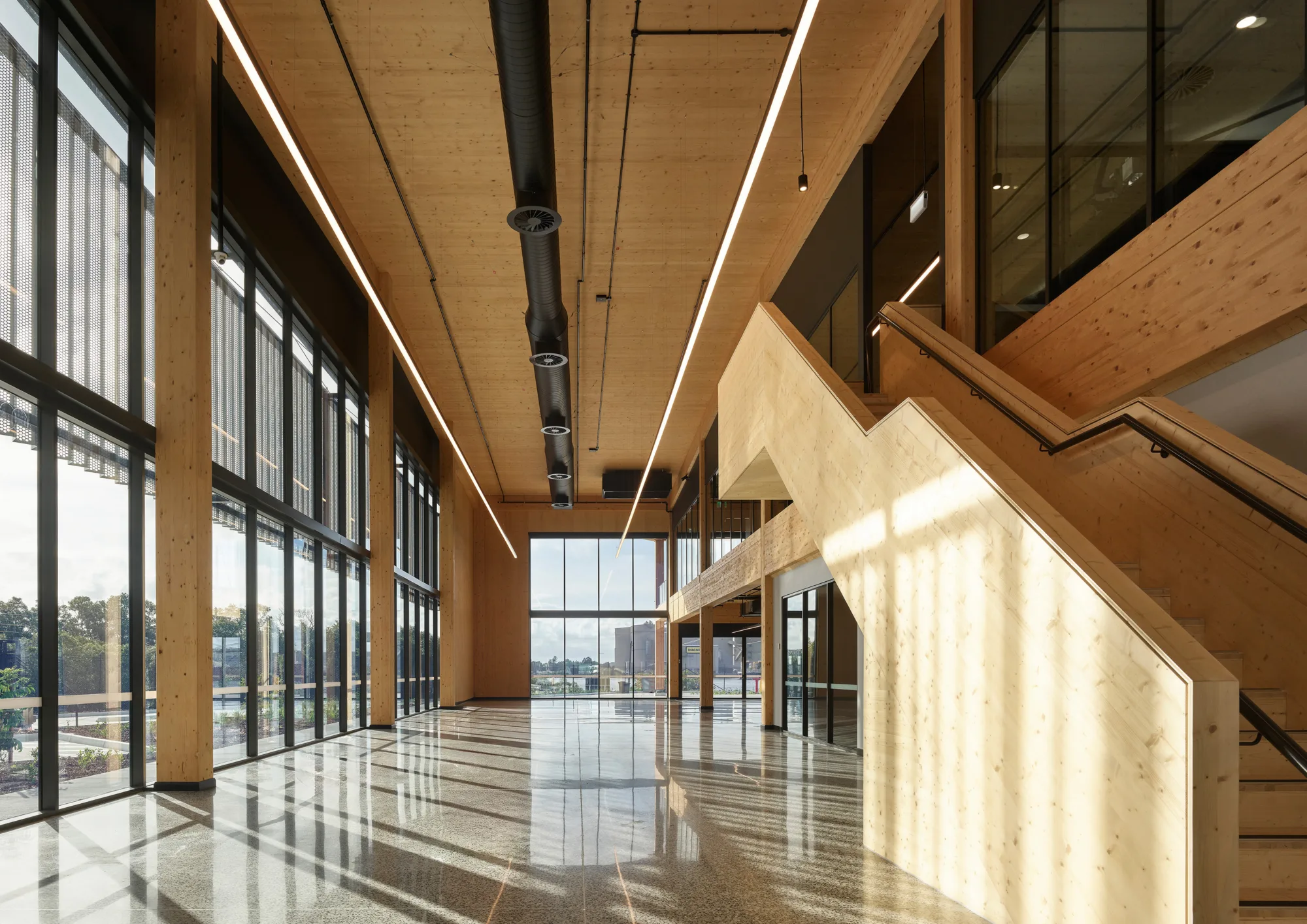 Targeting a 6 Star Green Star rating (v1.3), the facility integrates a range of advanced sustainability features, including a 1.1MW rooftop solar system for renewable energy generation, low carbon concrete to reduce embodied emissions, and a striking timber structure crafted from Glulam and Cross Laminated Timber (CLT). Water efficiency and recycling initiatives are also embedded into the design, with rainwater harvested for use in bathrooms and appliance testing, and water from fire system testing repurposed to minimise waste.